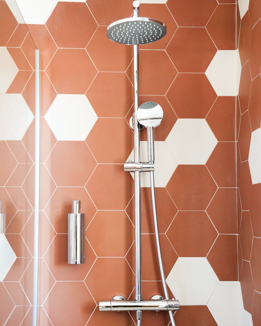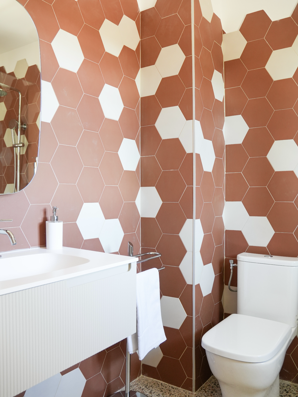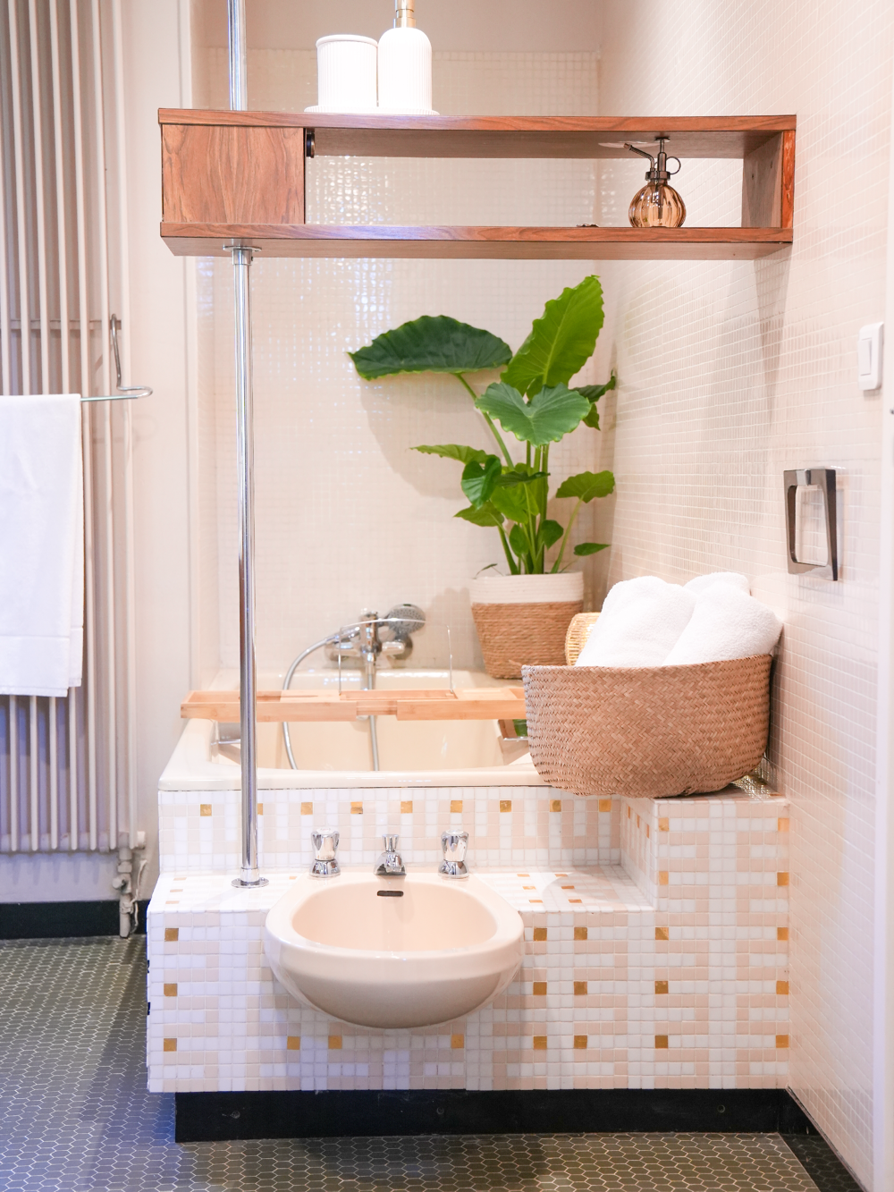 Rez-de-chaussée, deux chambres reliées par une salle d’eau avec douche et vasque