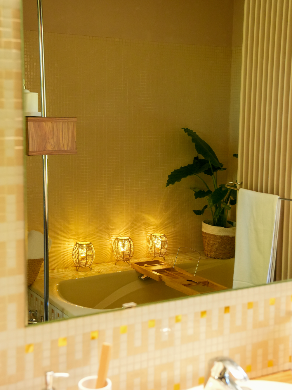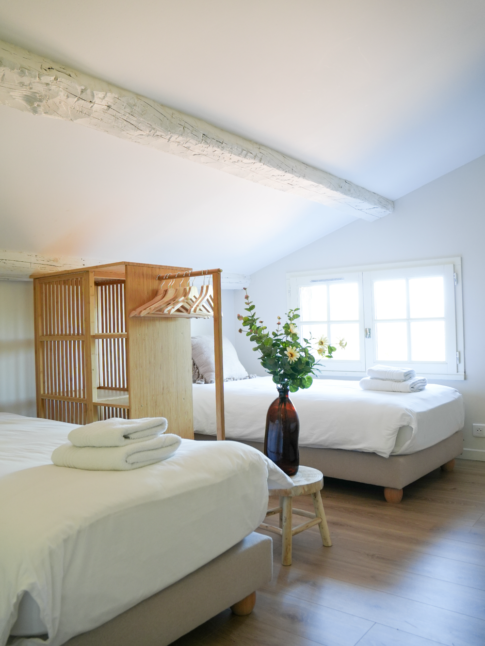 À l’étage, lit Queen Size, salle de bain privée (douche, vasque, WC), mezzanine avec deux lits simples modulables en lit King Size, accès à une terrasse commune.