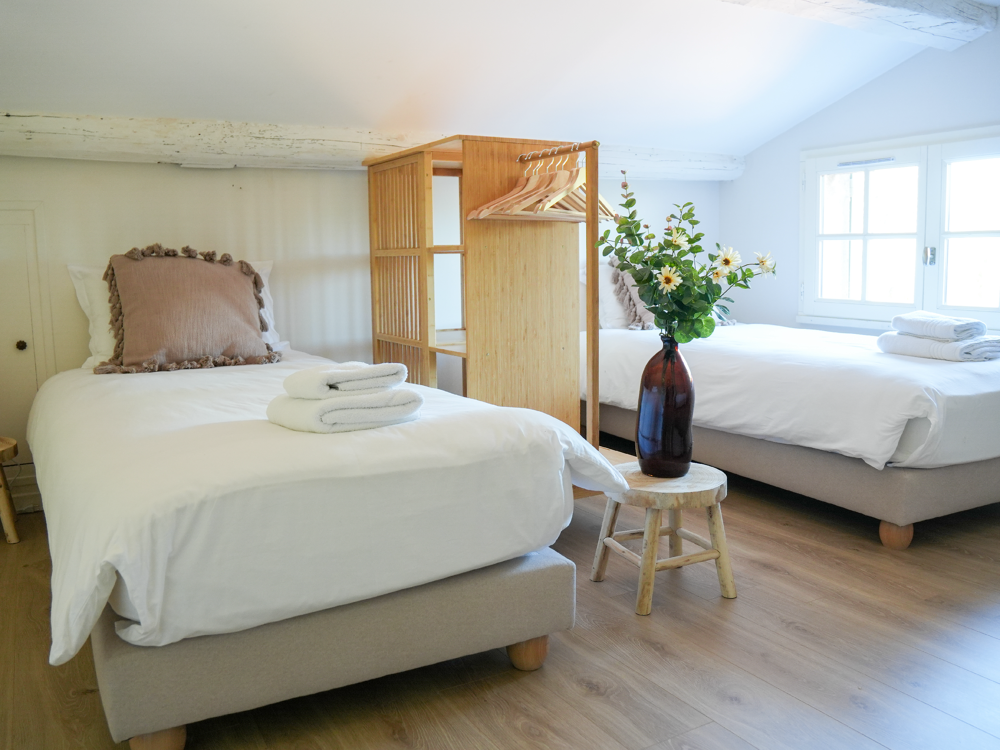 À l’étage, trois lits simples (possibilité lit King Size), accès à la terrasse commune.